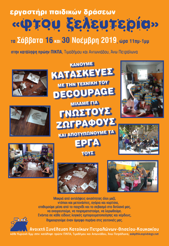 Εργαστήρι παιδικών δράσεων «ΦΤΟΥ ΞΕΛΕΥΤΕΡΙΑ» τα Σάββατα 16 και 30 Νοέμβρη, ώρα 11πµ-1µµ, στην κατάληψη πρώην ΠΙΚΠΑ.