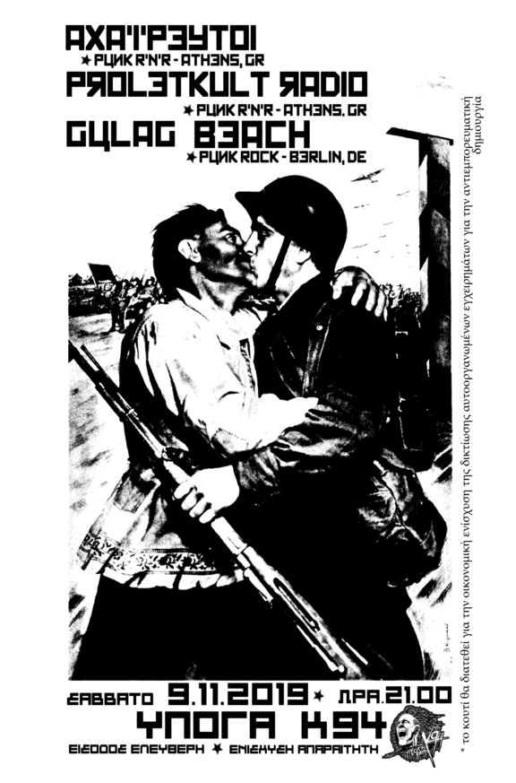Λάιβ το σάββατο 9 νοέμβρη στην υπόγα της καλλιδρομίου στον αριθμό 94 την ώρα 21.00 με τους proletkult radio, αχαΐρευτοι και gulag beach. Θα έχει χορό, μουσική, θα χορέψουμε με μουσική αλλά θα υπάρχει και χορευτική μουσική... απίστευτος συνδυασμός λέμε!