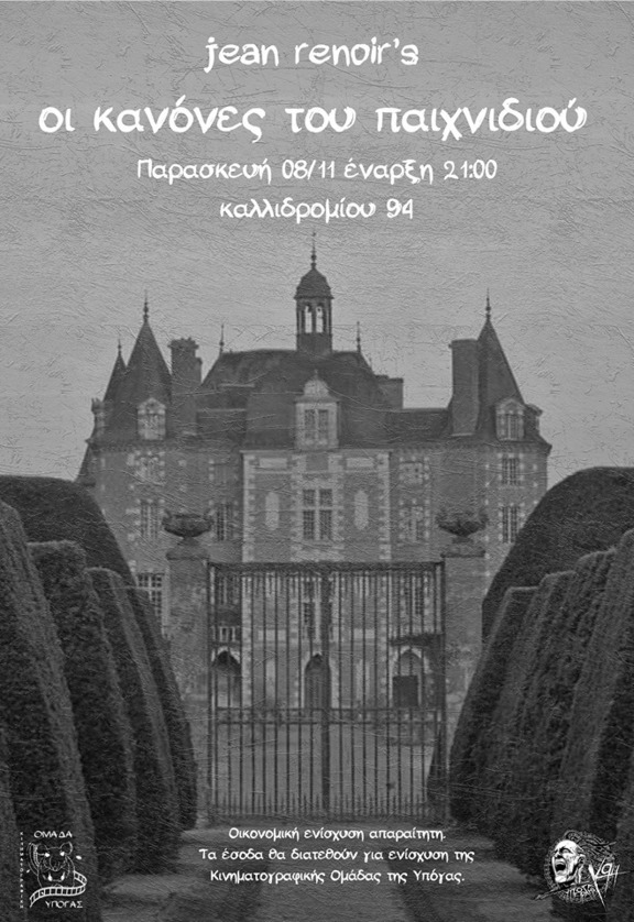Δεύτερη προβολή ταινίας για το Νοέμβριο, αυτήν την Παρασκευή (08/11), "Οι κάνόνες του παιχνιδιού" του Jean Renoir.
