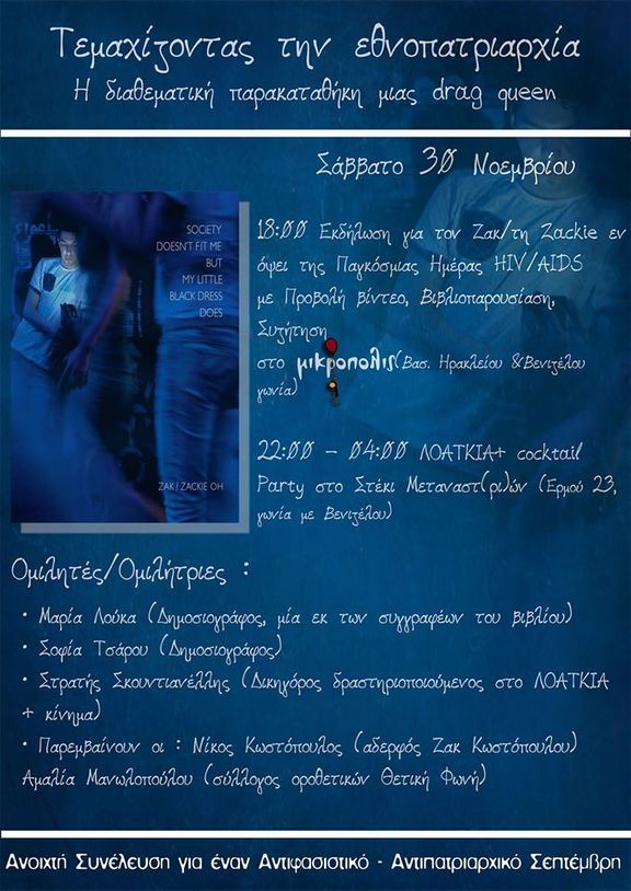 O Ζακ ήταν από τους πρώτους ανοιχτά οροθετικούς στον HIV ακτιβιστές. Η θεματική του πάρτι μας αμέσως μετά την εκδήλωση "Τεμαχίζοντας την Εθνοπατριαρχία" την παραμονή της Παγκόσμιας Ημέρας AIDS δε θα μπορούσε να είναι άλλη από την εναντίωση στο στίγμα της οροθετικότητας στον HIV.