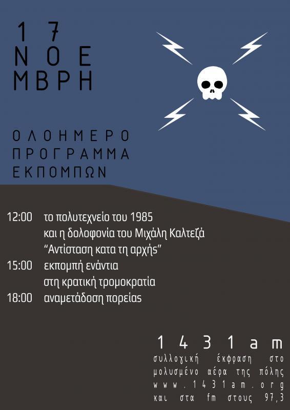 Στηρίζοντας τις συγκεντρώσεις εν όψει της 17 Νοέμβρη, θα πραγματοποιηθούν εκπομπές καθώς και αναμετάδοση της πορείας της Θεσσαλονίκης.