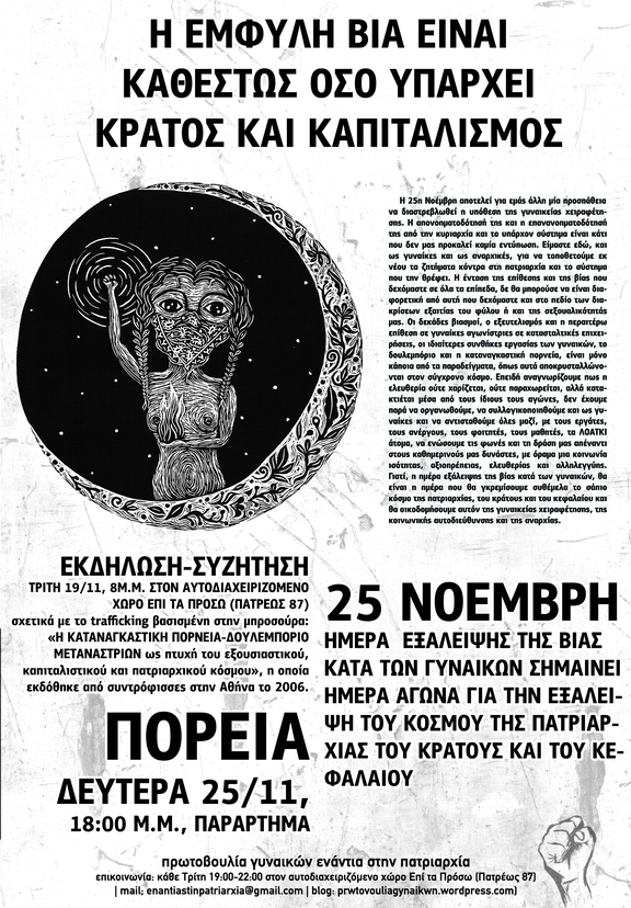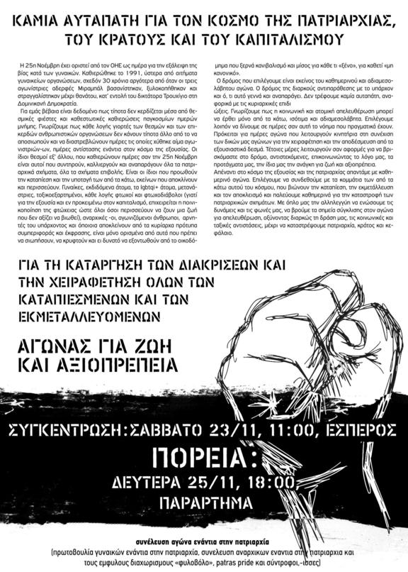 Η 25η Νοέμβρη αποτελεί για εμάς άλλη μία προσπάθεια να διαστρεβλωθεί η υπόθεση της γυναικείας χειραφέτησης. Η απονοηματοδότησή της και η επανανοηματοδότησή της από την κυριαρχία και το υπάρχον σύστημα είναι κάτι που δεν μας προκαλεί καμία εντύπωση. Είμαστε εδώ, και ως γυναίκες και ως αναρχικές, για να τοποθετούμε εκ νέου τα ζητήματα κόντρα στη πατριαρχία και το σύστημα που την θρέφει. Η ένταση της επίθεσης και της βίας που δεχόμαστε σε όλα τα επίπεδα, απ' άκρη σ' άκρη σε όλη τη γη, δε θα μπορούσε να είναι διαφορε-τική από αυτή που δεχόμαστε και στο πεδίο των διακρίσεων εξαιτίας του φύλου ή και της σεξουαλικότητάς μας. Οι δεκάδες βιασμοί, ο εξευτελισμός και η περαιτέρω επίθεση σε γυναίκες αγωνίστριες σε κατασταλτικές επιχειρήσεις, οι ιδιαίτερες συνθήκες εργασίας των γυναικών, το δουλεμπόριο και η καταναγκαστική πορνεία, είναι μόνο κάποια από τα παραδείγματα, όπως αυτά αποκρυσταλλώνονται στον σύγχρονο κόσμο.