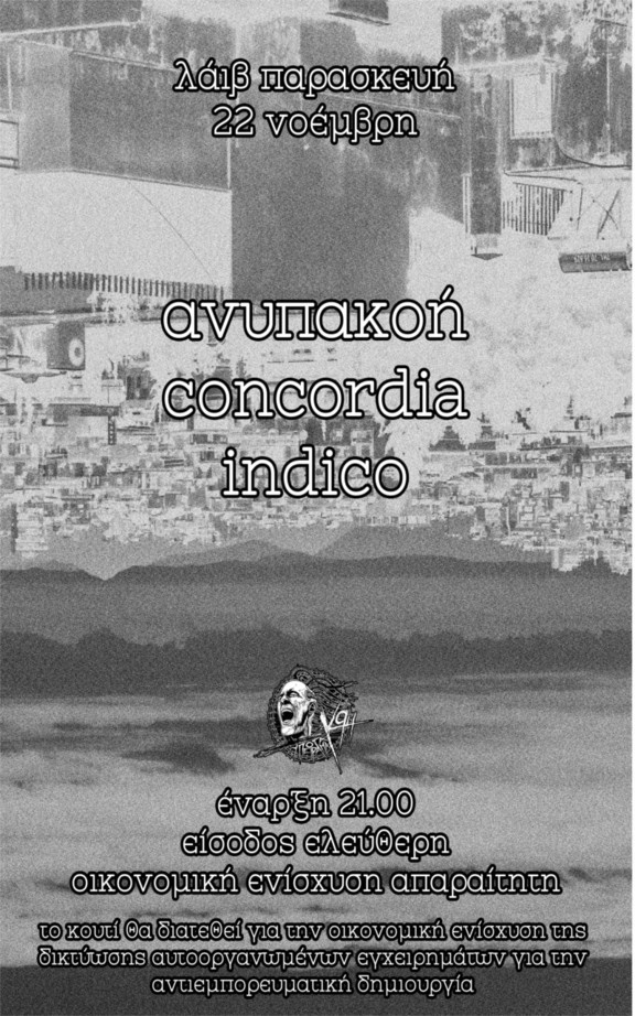 Παρασκευή 22 Νοέμβρη στις 21:00, live στο υπόγειο της Καλλιδρομίου 94. Εξαιρετικές μουσικές από τους Concordia, Indico, Ανυπακοή.