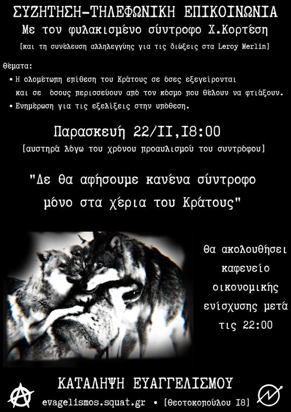 Την Παρασκευή 22/11 και ώρα 18:00[αυστηρά] θα υπάρξει τηλεφωνική επικοινωνία με τον σύντροφο Χ.Κορτέση και την συνέλευση αλληλεγγύης στην υπόθεση στα Leroy Merlin.Θα ακολουθήσει καφενείο οικονομικής ενίσχυσης.