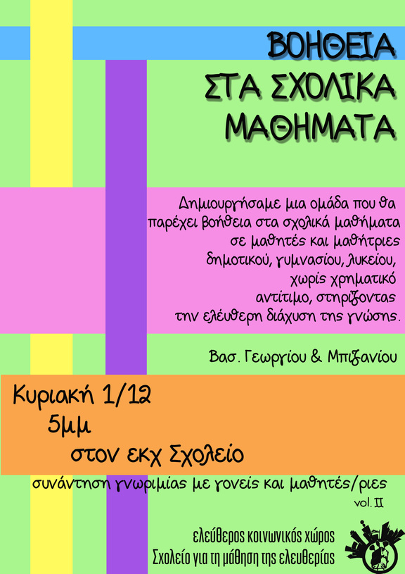 Στα πλαίσια της ελεύθερης διάχυσης της γνώσης που πρεσβεύει ο εκχ Σχολείο, δημιουργήσαμε μια ομάδα που θα παρέχει βοήθεια στα σχολικά μαθήματα σε μαθητές και μαθήτριες δημοτικού, γυμνασίου, λυκείου. Καλούμε σε μια δεύτερη μέρα γνωριμίας με γονείς και μαθητές/ριες, την Κυριακή 1/12 στις 5μμ.