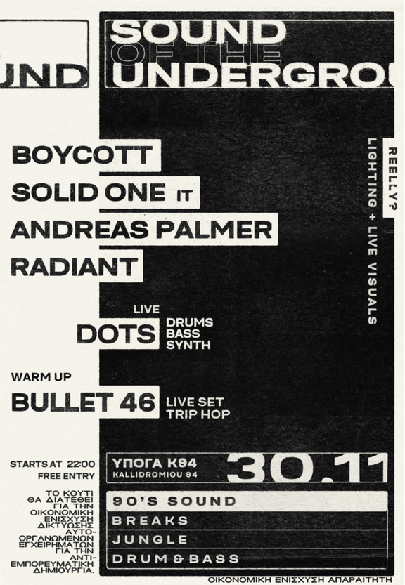 Σα φυσική συνέχεια από το "θόρυβώδες" κλίμα της Παρασκευής, περνάμε από την τζαμαϊκανή dub και reggae, στην χιπ χοπ μουσική των 80s και την ηλεκτρονική σκηνή της Αγγλίας του 1990, φτάνοντας στο Σάββατο 30 Νοέμβρη 2019. Καλλιδρομίου 94, τρία μέτρα κάτω από τη γη, γεμίζει το υπόγειο με συχνότητες και ρυθμούς drum 'n' bass, jungle, breaks και trip hop. Από τις 22.00 ξεκινάμε με μουσικές από dots, boycott, solid one, radiant, andreas palmer, bullet 46. Τη μουσική θα συνοδεύουν live visuals. Αυτοργανωμένα και αντιεμπορευματικά, χορευτικά και ηλεκτρονικά, ενωνόμαστε για να δώσουμε χρώμα στη γκρίζίλα γύρω μας.