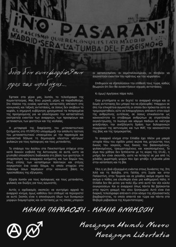 Το αίμα που χύθηκε δεν ξεπλένεται με τις αύρες της Ελληνικής Αστυνομίας, η μνήμη δεν είναι σκουπίδι, ώστε να πεταχτεί σε μια από τις χιλιάδες χωματερές ψυχών που έχει φτιάξει η εξουσία μέσα στην καταπίεση και τη βία. Όλη η γη βοά εξεγερμένη ενάντια στους δυνάστες της. Στη Χιλή και τη Βολιβία, στη Γαλλία, στη Συρία και στην Παλαιστίνη, στην Τουρκία και σε χιλιάδες σημεία που ακόμα ο πόθος για ελευθερία είναι μια καθημερινή μάχη. Για να πλεύσουμε από τους όρμους της εξεγερσιακότητας, στην ανοιχτή θάλασσα της συνολικής κοινωνικής και ταξικής αντεπίθεσης και χειραφέτησης. Για να γκρεμίσουμε τον γερασμένο κόσμο του φόβου, της υποταγής, της φτώχειας. Για να ζήσουμε τη μόνη ζωή που αξίζει να ζήσει κανείς, του αγώνα για την Κοινωνική Επανάσταση.
