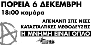 Καλούμε κάθε καταπιεσμένο και εκμεταλλευόμενο να συμμετάσχει στις διαδηλώσεις στις 6 Δεκεμβρίου, για να δώσουμε συλλογικά ένα σαφές μήνυμα αντίστασης απέναντι στην ολομέτωπη επίθεση που εξαπολύουν ενάντια στην κοινωνική βάση και τον κόσμο του αγώνα το κράτος και τα αφεντικά. Ραντεβού στους δρόμους, για να σπάσουμε το κλίμα της τρομοκρατίας που οι κυρίαρχοι προσπαθούν να επιβάλλουν, φοβούμενοι πως οι ημέρες αφθονίας τους στερεύουν, καθώς ήδη έχει αρχίσει η αντίστροφη μέτρηση για την επόμενη λαϊκή εξέγερση ή κοινωνική επανάσταση που θα επιζητήσει την καθολική ανθρώπινη χειραφέτηση και τη γενικευμένη κοινωνική αυτοδιεύθυνση.