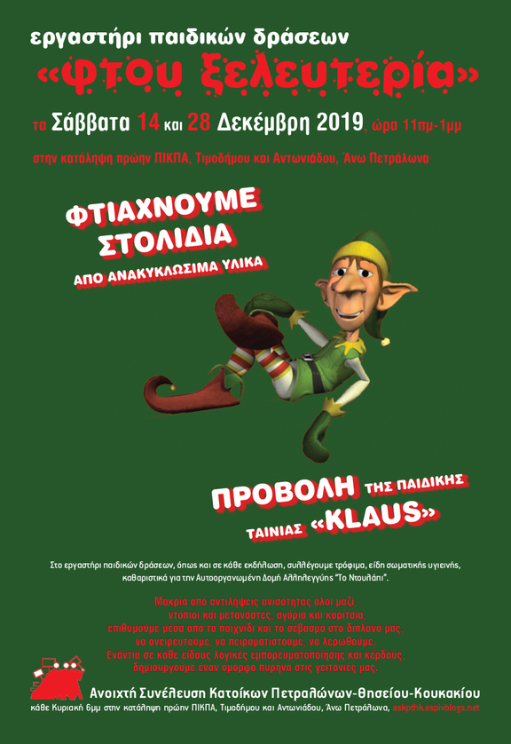 Τα Σάββατα 14 και 28 Δεκέμβρη στο παιδικό εργαστήρι φτιάχνουμε στολίδια από ανακυκλώσιμά υλικά και βλέπουμε μικροί και μεγάλοι την παιδική ταινία «Κlaus»