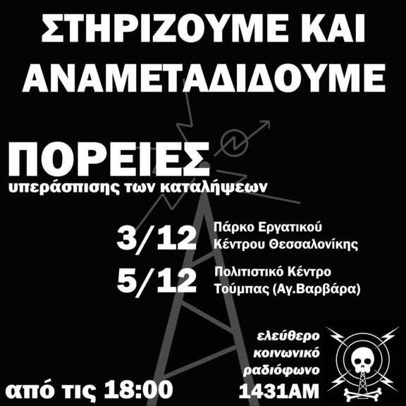 Στηρίζουμε και αναμεταδίδουμε ζωντανά τις πορείες υπεράσπισης των καταλήψεων στη Θεσσαλονίκη, στις 3 και 5 Δεκεμβρίου από τις 18:00.