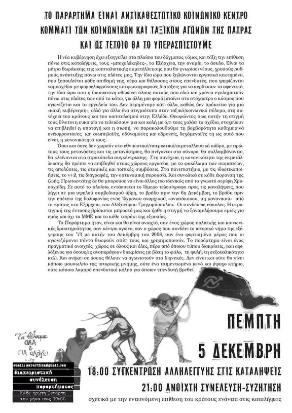 Πέμπτη 5 Δεκέμβρη στην κατάληψη Παρατήματος