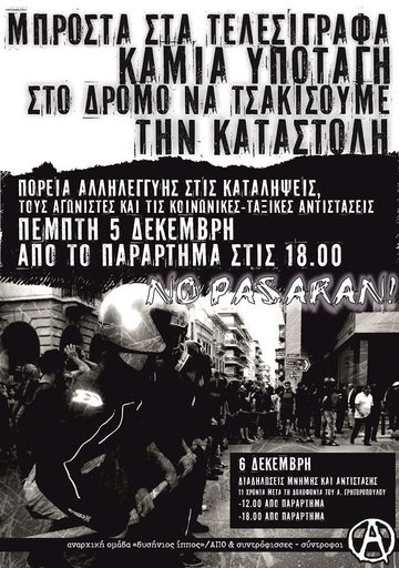 - Στηρίζουμε της κινητοποιήσεις μνήμης και αντίστασης της 6ης Δεκέμβρη, 11 χρόνια από τη δολοφονία του αναρχικού μαθητή Αλέξη Γρηγορόπουλου και την κοινωνική Εξέγερση του Δεκέμβρη 2008