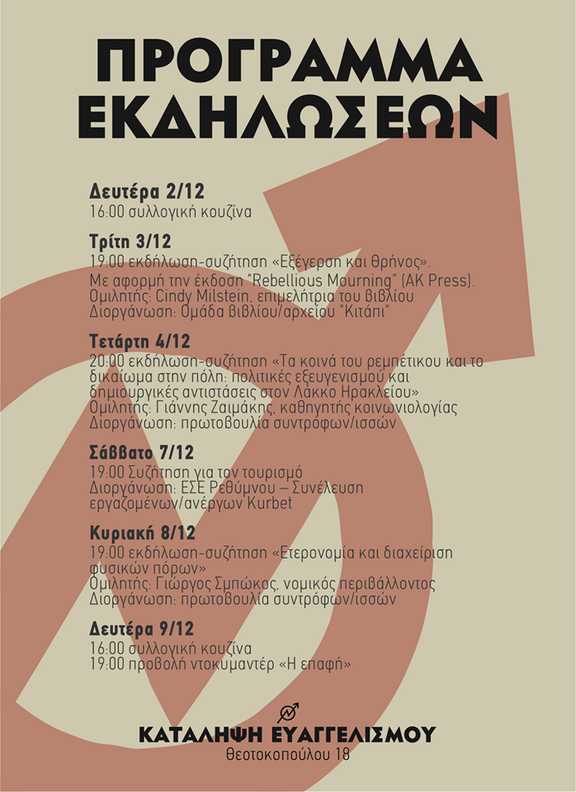 20:00 εκδήλωση συζήτηση «Τα κοινά του ρεμπέτικου και το δικαίωμα στην πάλη: πολιτικές εξευγενισμού και δημιουργικές αντιστάσεις στον Λάκκο Ηρακλείου» Ομιλητης: Γιάννης Ζαιμάκης. καθηγητής κοινωνιολογίας Διοργάνωση: πρωτοβουλία συντροφων/ισσών