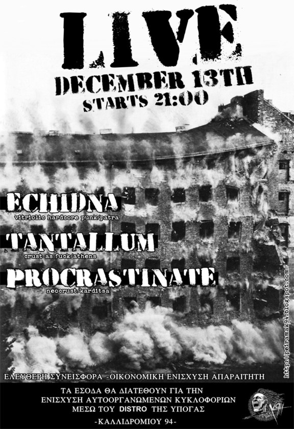 Δεκεμβριανός χαμός, στις δεκατρείς του μηνός!!! Από τις 21.00, μουσικές από Procrastinate, Echidna και Tantalum, βαράνε στο υπόγειο της Καλλιδρομίου. Ενισχύουμε την αυτοοργανωμένη μουσική σκηνή, στηρίζοντας οικονομικά τις μουσικές κυκλοφορίες.