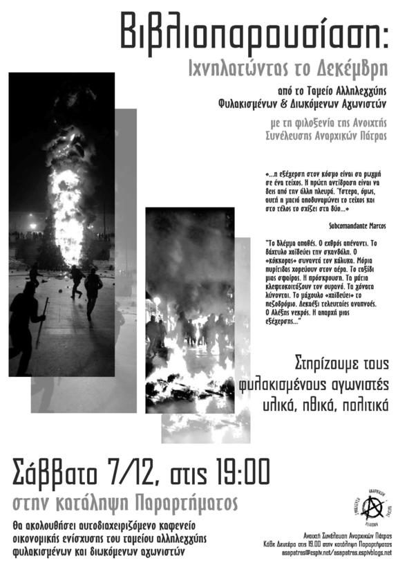 Στα πλαίσια στήριξης του ταμείου αλληλεγγύης στους φυλακισμένους και διωκόμενους αγωνιστές, αλλά και προώθησης του κινηματικού βιβλιοπωλείου της Ανοιχτής Συνέλευσης Αναρχικών Πάτρας το Σάββατο 7 Δεκεμβρίου στις 19:00 στην κατάληψη Παραρτήματος θα γίνει βιβλιοπαρουσίαση: Ιχνηλατώντας τον Δεκέμβρη των εκδόσεων του ταμείου. Θα ακολουθήσει καφενείο τα έσοδα του οποίου θα διατεθούν για την οικονομική στήριξη του ταμείου αλληλεγγύης στους φυλακισμένους και διωκόμενους αγωνιστές.