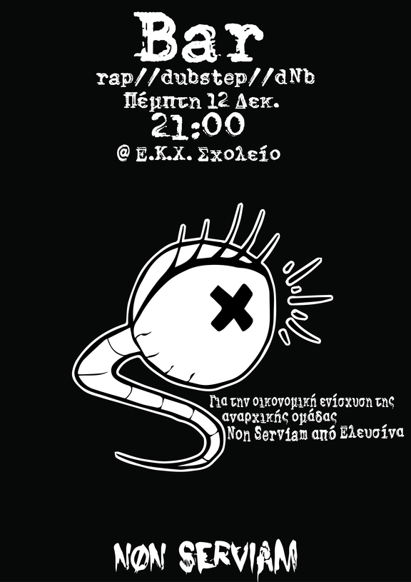 Bar για την οικονομική ενίσχυση της αναρχικής ομάδας Non Serviam από την Ελευσίνα ,στον ελεύθερο κοινωνικό χώρο ''Σχολείο''.