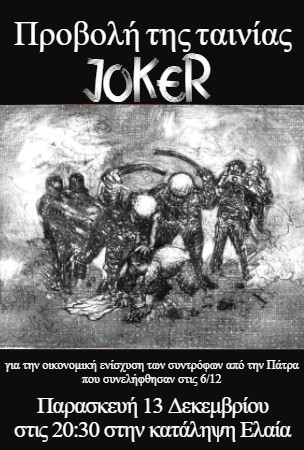 Την Παρασκευή 13/12 στις 20:30 θα γίνει προβολή της ταινίας Joker στην Κατάληψη Ελαία, για την οικονομική ενίσχυση των συλληφθέντων συντρόφων από την Πάτρα στις 06/12.