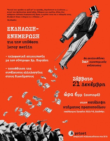 Σας υπενθυμίζουμε/ενημερώνουμε ότι στις 21/12 Σάββατο στις 18:00 μμ θα διεξαχθεί εκδήλωση/ενημέρωση για την υπόθεση Leroy Merlin