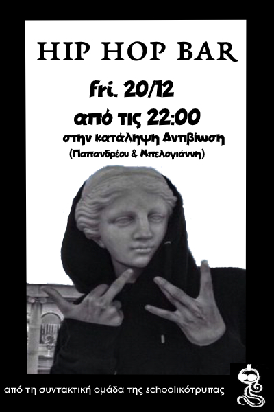 Την Παρασκευή 20/12 hip hop bar στην κατάληψη Αντιβίωση, από την συντακτική ομάδα εντύπου που μοιράζεται στα Λύκεια της πόλης των Ιωαννίνων,την schoolικότρυπα.