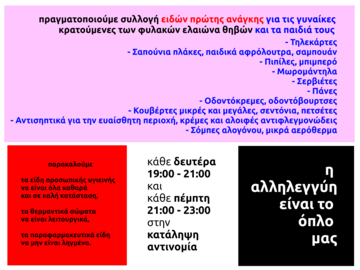 Η συλλογή των ειδών θα πραγματοποιείται στην κατάληψη Αντινομία κάθε Δευτέρα 19:00-21:00 και κάθε Πέμπτη 21:00-23:00.