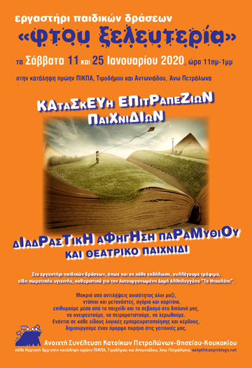 Εργαστήρι παιδικών δράσεων «ΦΤΟΥ ΞΕΛΕΥΤΕΡΙΑ» τα Σάββατα 11 και 25 Ιανουαρίου, ώρα 11πµ-1µµ, στην κατάληψη πρώην ΠΙΚΠΑ