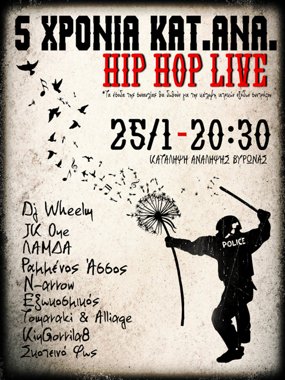 Hip Hop συναυλία για τα 5 χρόνια της Κατάληψης Ανάληψης. Συμμετέχουν οι:Dj Wheelm,Λάμδα, Ραμμένος Άσσος, Σκοτεινό φως, Εξωκοσμικος, N- arrow, KinGorrila8, Jk one,Tomaraki & Alliage.