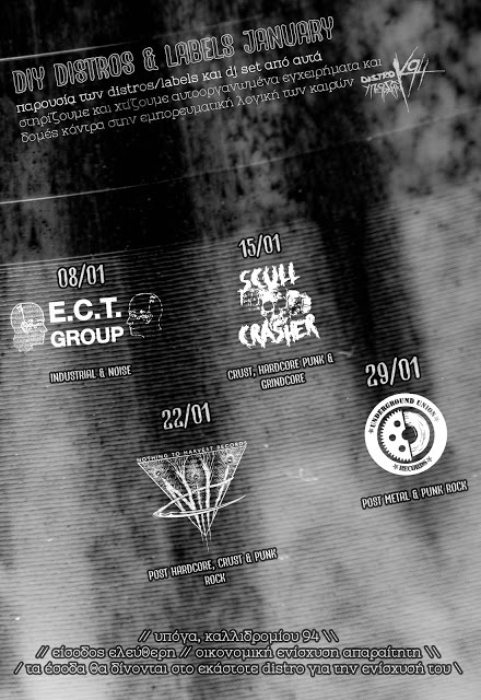 Τον μήνα Ιανουάριο στα τεταρτιάτικα καφενεία της υπόγας, θα φιλοξενηθούν distro/label, όπου τα έσοδα θα διατεθούν για την οικονομική τους στήριξη.