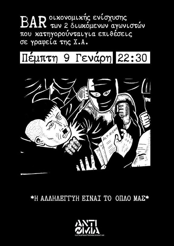 Bar αλληλεγγύης και οικονομικής υποστήριξης των 2 διωκόμενων αγωνιστών που κατηγορούνται με ένα σαθρό και ανυπόστατο κατηγορητήριο για επιθέσεις σε γραφεία των νεοναζί της Χ.Α.. Στους συντρόφους έχουν επιβληθεί αυστηροί περιοριστικοί όροι μεταξύ των οποίων είναι η υποχρεωτική εμφάνιση τέσσερις φορές τον μήνα στο Α.Τ της περιοχής τους και η καταβολή εγγύησης ύψους 15.000 ευρώ στον καθένα μέχρι τις 17.1.2020 προκειμένου να παραμείνουν ελεύθεροι.