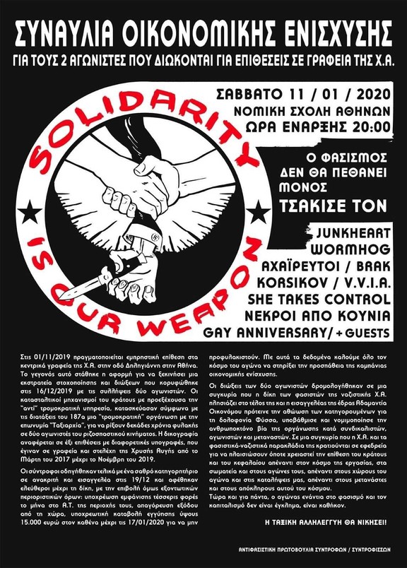 Συναυλία οικονομικής ενίσχυσης για τους 2 αγωνιστές που διώκονται για επιθέσεις στα γραφεία της ΧΑ (Νομική, 11/1)