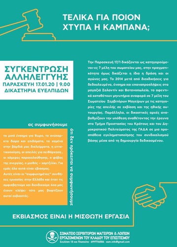 Στις 19 Δεκέμβρη ξεκίνησε επιτέλους, μετά από αναβολές 5 χρόνων, η δίκη 7 μελών του σωματείου μας με την κατηγορία της απόπειρας εκβιασμού και της ηθικής αυτουργίας. Τα αφεντικά του Σαλαντίν και του Βοτανοπωλείου βάφτισαν «εκβιασμό» τις εργατικές διεκδικήσεις των εργαζομένων και τις δράσεις του σωματείου και την υπόθεση ανέλαβε η πάντα πρόθυμη Ασφάλεια και συγκεκριμένα το Τμήμα Προστασίας του Δημοκρατικού Πολιτεύματος (!!!).