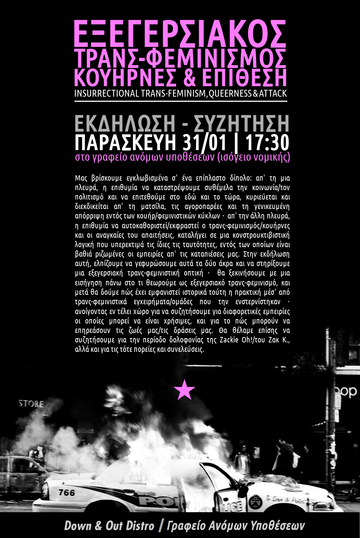 Μας βρίσκουμε εγκλωβισμένα σ' ένα επίπλαστο δίπολο: απ' τη μια πλευρά, η επιθυμία να καταστρέψουμε συθέμελα την κοινωνία/τον πολιτισμό και να επιτεθούμε στο εδώ και το τώρα, κυριεύεται και διεκδικείται απ' τη ματσίλα, τις αγοροπαρέες και τη γενικευμένη απόρριψη εντός των κουήρ/φεμινιστικών κύκλων · απ' την άλλη πλευρά, η επιθυμία να αυτοκαθοριστεί/εκφραστεί ο τρανς-φεμινισμός/κουήρνες και οι αναγκαίες του απαιτήσεις, καταλήγει σε μια κονστρουκτιβιστική λογική που υπερεκτιμά τις ίδιες τις ταυτότητες, εντός των οποίων είναι βαθιά ριζωμένες οι εμπειρίες απ' τις καταπιέσεις μας. Στην εκδήλωση αυτή, ελπίζουμε να γεφυρώσουμε αυτά τα δύο άκρα και να στηρίξουμε μια εξεγερσιακή τρανς-φεμινιστική οπτική · θα ξεκινήσουμε με μια εισήγηση πάνω στο τι θεωρούμε ως εξεγερσιακό τρανς-φεμινισμό, και μετά θα δούμε πώς έχει εμφανιστεί ιστορικά τούτη η πρακτική μέσ' από τρανς-φεμινιστικά εγχειρήματα/ομάδες που την ενστερνίστηκαν · ανοίγοντας εν τέλει χώρο για να συζητήσουμε για διαφορετικές εμπειρίες οι οποίες μπορεί να είναι χρήσιμες, και για το πώς μπορούν να επηρεάσουν τις ζωές μας/τις δράσεις μας. Θα θέλαμε επίσης να συζητήσουμε για την περίοδο δολοφονίας της Zackie Oh!/Ζακ Κ., αλλά και για τις τότε πορείες και συνελεύσεις.