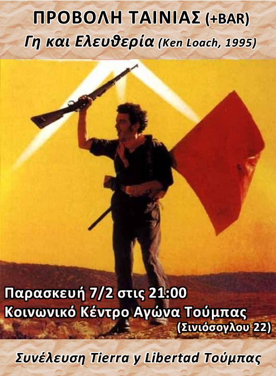 Προβολή της ταινίας "Land and Freedom" (Ken Loach, 1995) στο Κοινωνικό Κέντρο Αγώνα Τούμπας (Σινιόσογλου 22), την Παρασκευή 07/02 στις 21:00.