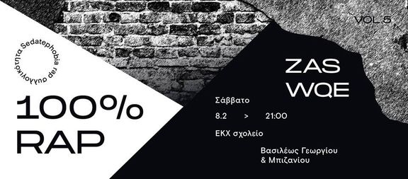 Tο 5ο "100% RAP" event επιστρέφει στον Ελεύθερο Κοινωνικό Χώρο "Σχολείο" με τους WQE και ZAS, από τις 21:00 και μετά, να αναλαμβάνουν τον ήχο στα decks!!!