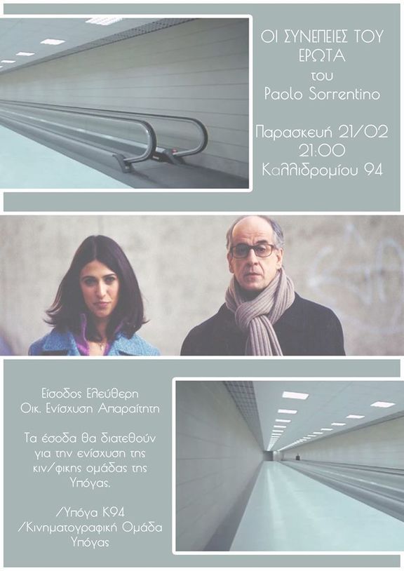 Για κλείσιμο του noir μήνα, η κινηματογραφική ομάδα της Υπόγας, επέλεξε τις "Συνέπειες Του Έρωτα" του Paolo Sorrentino. Μαζευόμαστε από τις 9.00, και ξεκινάμε την προβολή στις 9.30 ![]()
