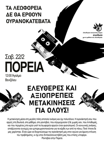Το ζητούμενο δεν είναι αν ο νέος φορέας που θα συσταθεί θα είναι ιδιωτικός, κρατικός ή σύμπραξη και των δυο. Για εμάς το ζητούμενο είναι να έχουμε δημόσιες και ελεύθερες μετακινήσεις για όλους: εργαζόμενους, φοιτητές, συνταξιούχους, άνεργους, μετανάστες. Καθένας από μας αναγκάζεται να χρησιμοποιεί το λεωφορείο, για να πάει στη δουλεία, στη σχολή, στο νοσοκομείο κτλ. Επομένως, μην έχετε καμία απαίτηση να πληρώνουμε εισιτήριο. Το κόμιστρο να το επωμιστούν εκείνοι που επωφελούνται από τον τελικό μας προορισμό, τα αφεντικά και το κράτος.