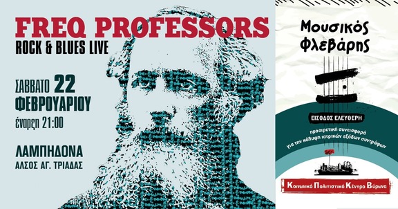Στο πλαίσιο του "Μουσικού Φλεβάρη" που διοργανώνουμε ως Κοινωνικό - Πολιτιστικό Κέντρο Βύρωνα με σκοπό να καλυφθούν ιατρικά έξοδα συντρόφων, το Σάββατο 22 Φεβρουαρίου στις 9 μ.μ. ανεβαίνουν στη σκηνή της Λαμπηδόνας οι: