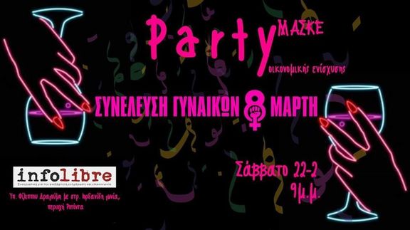 Το Σάββατο 22/02 η "Συνέλευση Γυναικών 8 Μάρτη" σας προσκαλεί στο (μασκέ) πάρτι οικονομικής ενίσχυσης της καμπάνια διοργάνωσης της φεμινιστικής απεργίας της 8ης Μάρτη 2020 που θα φιλοξενηθεί στο χώρο του infolibre.gr (Υπουργού Φίλιππου Δραγούμη και στρατηγού Ιορδανίδη γωνία, περιοχή Ροτόντας).