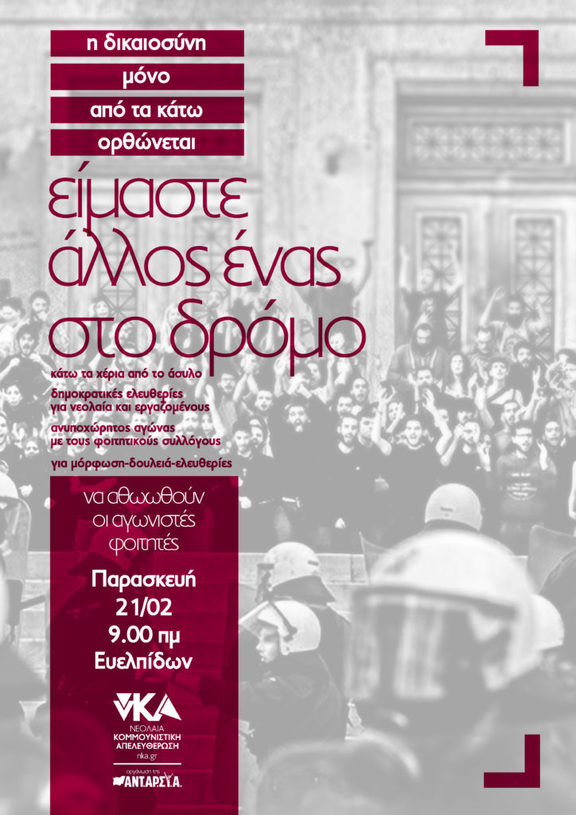 - Απαιτούμε την αθώωση των φοιτητών και μελών της νΚΑ, Δ. Κ. και Γ.Π. που δικάζονται στις 21 Φλεβάρη και να μην τους ασκηθεί καμία δίωξη!