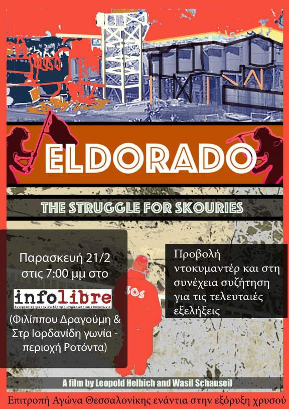 Την προβολή του ντοκιμαντέρ ELDORADO των Leopold Helbich και Wasil Schauseil διοργανώνει η Επιτροπή Αγώνα ενάντια στην εξόρυξη χρυσού, την Παρασκευή 21 Φεβρουαρίου στις 19:00. Η εκδήλωση θα πραγματοποιηθεί στο χώρο του συνεργατικού εγχειρήματος για την ανεξάρτητη ενημέρωση και επικοινωνία infolibre (Υπ. Φιλίππου Δραγούμη 4, περιοχή Ροτόντας).