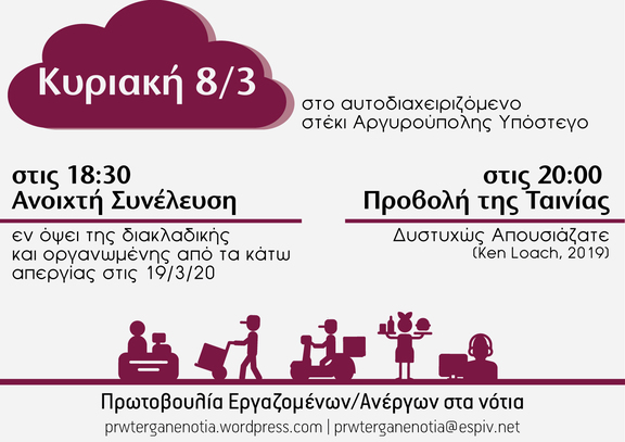 Την Κυριακή 8 Μαρτίου 2020 η Πρωτοβουλία Εργαζομένων/Ανέργων στα νότια αναλαμβάνει το κυριακάτικο καφενείο του Υποστέγου [25ης Μαρτίου 38]