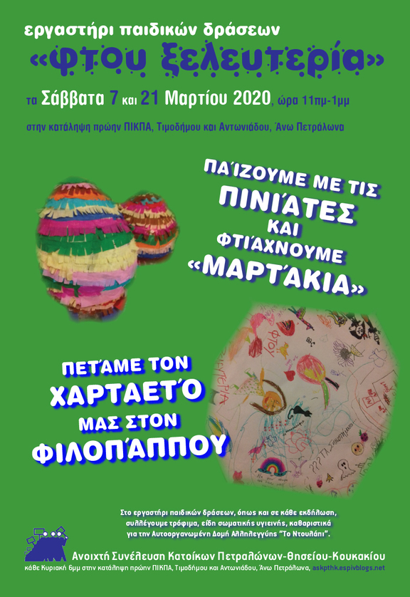 Εργαστήρι παιδικών δράσεων «ΦΤΟΥ ΞΕΛΕΥΤΕΡΙΑ» τα Σάββατα 7 και 21 Μαρτίου, ώρα 11πµ-1µµ, στην κατάληψη πρώην ΠΙΚΠΑ, Τιµοδήµου και Αντωνιάδου, Άνω Πετράλωνα.