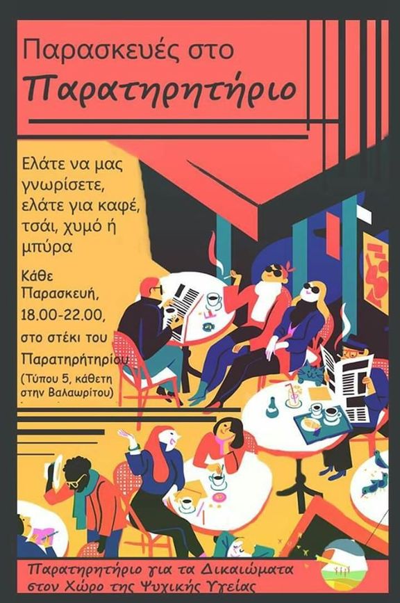 Σας περιμένουμε όλους/ες την Παρασκευή στις 20:00 μία ημέρα πριν το Disco party μας, στο στέκι του Παρατηρητηρίου (Τύπου 5), να επιλέξουμε την ταινία που θέλουμε να δούμε, να πιούμε χαλαρά τη μπυρίτσα μας και να δημιουργήσουμε ομάδα συζήτησης περί ψυχικής ασθένειας και αντιμετώπισης κοινωνικών προβλημάτων χωρίς κανένα απολύτως ταμπού με τα μέλη του Παρατηρητηρίου! Ωστόσο, το στέκι του Παρατηρητηρίου θα είναι ανοιχτό από τις 18:00, όπως κάθε Παρασκευή!