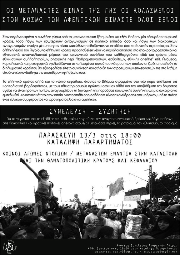 Από την πλευρά μας, δε μπορούμε παρά να αντιλαμβανόμαστε πως όλοι εμείς που βρισκόμαστε στους από τα κάτω αυτού του κόσμου, αποτελούμε για το κράτος και τα αφεντικά το φτηνό υποταγμένο, ανανεώσιμο και αναλώσιμο υλικό των επόμενων γύρων της καπιταλιστικής ανάπτυξης. Πάνω στα σώματα των μεταναστών/ριών βρίσκεται το πεδίο πειραματισμού πολιτικών καταστολής και ελέγχου, το οποίο θα το συναντήσουμε ή το συναντάμε με διάφορες εκφάνσεις όλοι και όλες μας. Με πρόταγμά μας την αλληλεγγύη μεταξύ των καταπιεσμένων, στεκόμαστε δίπλα στους αγώνες των μεταναστών/τριών, κόντρα και ενάντια σε κάθε επίπλαστο διαχωρισμό στη βάση της φυλής, του φύλου, του έθνους, της θρησκείας, της σεξουαλικής προτίμησης. Συγκροτώντας μαχητικές κοινότητες αγώνα με σχέσεις ισότιμες, χρησιμοποιώντας εργαλεία αγώνα όπως οι καταλήψεις και δημιουργώντας δομές αλληλοβοήθειας, να πυκνώσουμε τις αντιστάσεις μας και να οξύνουμε τον ταξικό-κοινωνικό πόλεμο με όπλο μας την αυτοοργάνωση.