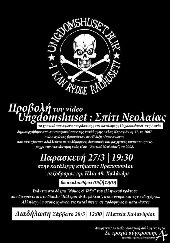 Με την πανδημία του κορονοιού να επικαθορίζει κάθε στιγμή της ζωής και λόγω της ακραίας καταστολής που κορυφώθηκε με την απαγόρευση κυκλοφορίας, αναβάλλεται η προβολή-συζήτηση Ungdomshuset: Σπίτι Νεολαίας (το χρονικό του αγώνα υπεράσπισης της κατάληψης Ungdomshuset στη Δανία). Η κρατική εκστρατεία έχει ξεκάθαρα στόχο να μετακυλήσει τις ευθύνες για την διάδοση της νόσου στις πλάτες των καταπιεσμένων, ενώ ταυτόχρονα επιχειρεί να αποκρύψει ότι το ίδιο το καπιταλιστικό σύστημα είναι η αιτία δημιουργίας και ταχείας εξάπλωσής της. Την ώρα που εγκαινιάζεται μια νέα εποχή θυσιών για τους εκμεταλλευόμενους, την ώρα που οι κυρίαρχοι προστάζουν, για ολοκληρωτική υπαγωγή κάθε πτυχής της ζωής μας στις κρατικές πολιτικές, να εμπιστευτούμε ξανά την κοινωνική και συλλογική συνείδηση. Η αλληλεγγύη δεν στηρίζεται στις κενές εκκλήσεις για ατομική ευθύνη και ατομικά μέτρα προστασίας, παρά βασίζεται στη δύναμη της συλλογικής αυτοάμυνας. Η καμπάνια «Μένουμε σπίτι» επιχειρεί να αφήσει ένα νέο αποτύπωμα στις ζωές μας. Το αποτύπωμα της ολοκλήρωσης του κοινωνικού ελέγχου και των πολιτικών εξαίρεσης και αποκλεισμού. Δεν τρομοκροτούμαστε από τις απειλές και τις διαταγές για έλεγχο των ζωών μας και από την απαγόρευση κυκλοφορίας. Δημιουργούμε δίκτυα αλληλοβοήθειας σπάζοντας την απομόνωση και την κρατική διαμεσολάβηση. Αμφισβητούμε την απαγόρευση κυκλοφορίας, πράττοντας όπως μπορούμε ενάντια στο καθεστώς ελέγχου κι επιτήρησης.