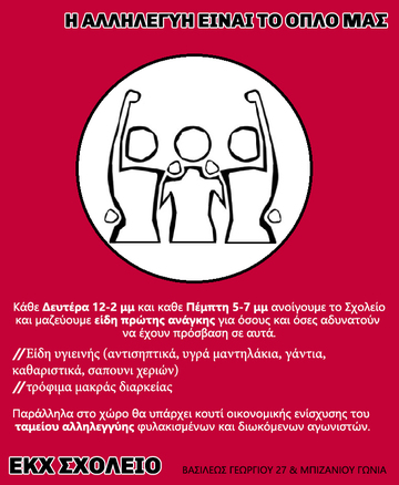 Συμπληρωματικά στo Αυτοοργανωμένο Δίκτυο Αλληλεγγύης και την έκτακτη λειτουργία του Ποδηλατικού συνεργείου, στον Ε.Κ.Χ. Σχολείο θα γίνεται συλλογή ειδών πρώτης ανάγκης για όσους και όσες αδυνατούν να έχουν πρόσβαση σε αυτά: