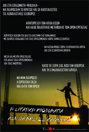 - αντίσταση στην αντεργατική επίθεση, την οποία έχουν εξαπολύσει οι κυβερνώντες και τα αφεντικά με αφορμή την κρίση του κορονοϊού