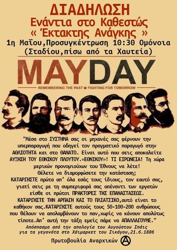 Τη στιγμή που το κράτος και τα αφεντικά προσπαθούν να θέσουν σε καραντίνα τις ταξικές αντιστάσεις, τις εργατικές διεκδικήσεις και τη συνδικαλιστική δράση των εργαζομένων, η κυβέρνηση ανήγγειλε τη μεταφορά της Πρωτομαγιάς από 1/5 στις 9/5, ημέρα Σάββατο! Χρησιμοποιώντας υγειονομικά προσχήματα, η κυβέρνηση επιχειρεί αφενός να απονοηματοδοτήσει το πολιτικό και ταξικό περιεχόμενο της Εργατικής Πρωτομαγιάς, κάνοντας λόγω για περιορισμό των μετακινήσεων των επίδοξων εκδρομέων, ανάγοντας την Πρωτομαγιά σε μια κοινή εορταστική ημέρα, αφαιρώντας έτσι τον ταξικό και απεργιακό της χαρακτήρα. Η Εργατική Πρωτομαγιά δεν είναι ούτε αργία, ούτε μια εορταστική ημέρα πνευματιστικού ή μετα-παγανιστικού χαρακτήρα. Μια τέτοια αντίληψη βολεύει την τάξη των κυρίαρχων, γι' αυτό και προωθείται από αυτήν κατά τέτοιον συστηματικό τρόπο, ώστε να έχει εγγραφεί με αυτό το νόημα στην αλλοτριωμένη συνείδηση μεγάλου τμήματος της κοινωνίας. Για μας, όμως, η Εργατική Πρωτομαγιά είναι απεργία. Είναι μια ημέρα-ορόσημο που συνδέει το νήμα των αγώνων του παρελθόντος με τις σημερινές ταξικές αντιστάσεις της εργατικής τάξης. Είναι μια ημέρα για τους αγωνιζόμενους και τους νεκρούς της εργατικής τάξης, καθώς και μία ημέρα που λειτουργεί σαφώς και ως υπόμνηση για τους αναρχικούς επαναστάτες που κρεμάστηκαν από τις κρατικές αρχές στο Σικάγο, διότι στρατεύθηκαν ανυποχώρητα στον αγώνα για την απελευθέρωση της εργατικής τάξης και την ικανοποίηση των άμεσων υλικών αναγκών της, της 8ωρης ημερήσιας εργασίας συγκεκριμένα. Αυτήν την ταξική μνήμη καλούμαστε να υπερασπιστούμε σήμερα, τώρα που το κράτος και το κεφάλαιο επιτίθενται συντονισμένα, για να σαρώσουν με σιδηρά πυγμή τις αντιστάσεις και τα κεκτημένα του εργατικού κινήματος.