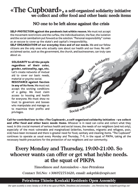 Call for contributions to the «The Cupboard», a self-organized solidarity initiative - we collect and offer food and other basic needs items. Whoever is in need can come and collect what they need. In this crucial moment of serious health and social issues, the needs of our neighbors (and not only), especially of the most vulnerable and marginalized (elderlies, homeless, migrants and refugees, poor, sick) have been increased and there is greater need for food, sanitary and cleaning items. "The Cupboard" continues to operate as usual every Monday and Thursday, 7-9pm, in the squat of PIKPA, taking all the necessary health precautions for the protection of our neighbors and our community.