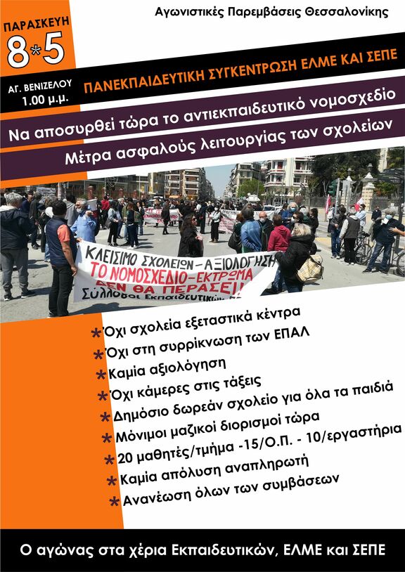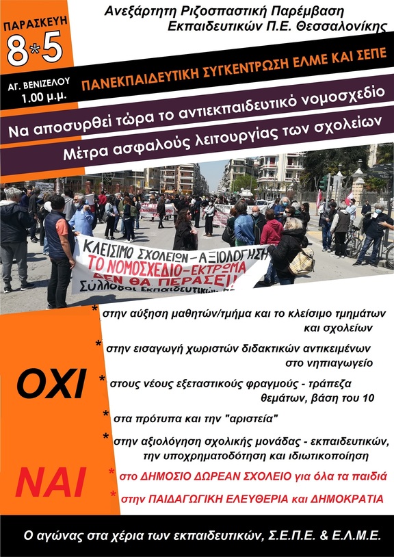 - Πανεκπαιδευτική συγκέντρωση την Παρασκευή 8-5-2020, στο Άγαλμα Βενιζέλου από κοινού με Συλλόγους δασκάλων, γονείς και φοιτητές, απαιτώντας: