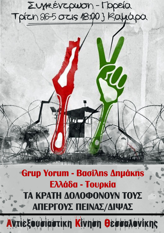 Τιμούμε τη μνήμη της αγωνίστριας Helin Bölek και των αγωνιστών Ibrahim Göckçek και Mustafa Koçak, που δολοφονήθηκαν από το τούρκικο κράτος, μετά από πολύμηνες απεργίες πείνας, αγωνιζόμενοι για τη δικαίωση των αιτημάτων του συγκροτήματος Grup Yorum και την υπεράσπιση των δικαιωμάτων των διωκόμενων αγωνιστών. Απαιτούμε την άμεση δικαίωση των απεργών πείνας μέχρι θανάτου στην Τουρκία. Απαιτούμε την άμεση αποφυλάκιση των 11 συλληφθέντων Τούρκων και Κούρδων αγωνιστών από το ελληνικό κράτος, το οποίο συμβάλλει στις δολοφονικές πολιτικές των υπηρεσιών της Τουρκίας απέναντι στους αγωνιζόμενους. Ενάντια στην κρατική και καπιταλιστική βαρβαρότητα, οι καταπιεσμένοι και εκμεταλλευόμενοι σε κάθε γωνιά του πλανήτη, όλοι όσοι αγωνίζονται, δίνουμε τις μάχες αυτές που θα οικοδομήσουν μια κοινωνία ισότητας, ελευθερίας και αλληλεγγύης, μέχρι τα τραγούδια του αγώνα να ανθίσουν και να γκρεμίσουν τον χρεοκοπημένο κόσμο των κυρίαρχων.